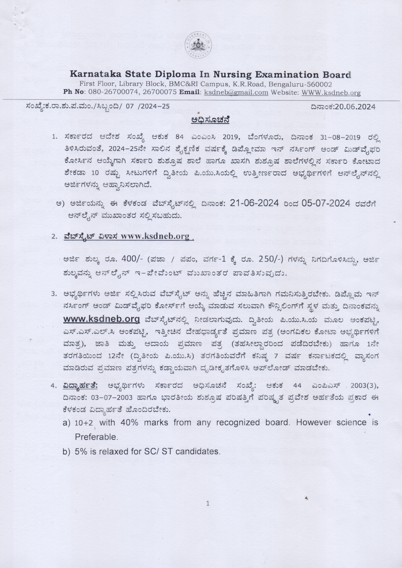 Karnataka Nursing and Para Medical Regulating Authority (Act-2012) KARNATAKA STATE DIPLOMA IN NURSING EXAMINATION BOARD 1st Floor, Library Block BMCRI Campus K R Road, Bengaluru-02, Ph: 080-26700074, 26700075 Fax: 080-26700034 Email:ksdneb@gmail.com
